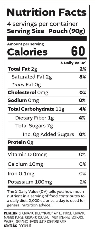 As with all White Leaf Provisions products, this mango coconut applesauce is regeneratively farmed, organic & GMO-free. It is grown without the use of chemical pesticides, fertilizers or herbicides, instead grown and manufactured in harmony with the earth, helping to heal the planet that our kids will inherit, and bringing the Farm to eComm®.